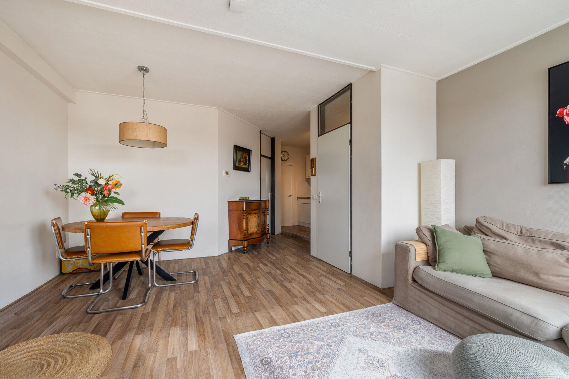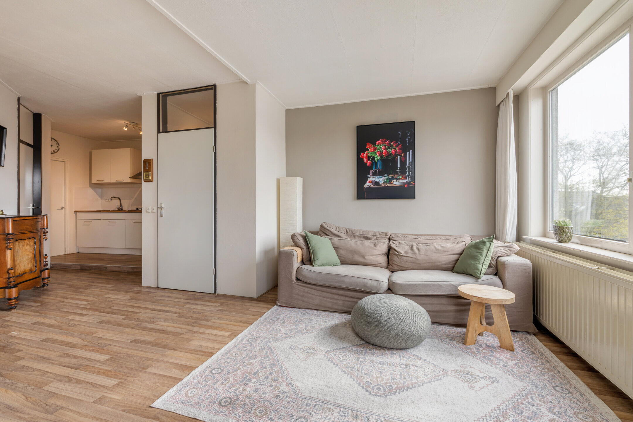 De verrassend ruime woonkamer (ca. 5.21 x 4.55m) is afgewerkt met een nette laminaatvloer en kent op elk moment van de dag een fijne lichtinval door de grote raampartijen. Daarnaast is er vanaf de bovenste verdieping een heerlijk wijds uitzicht.