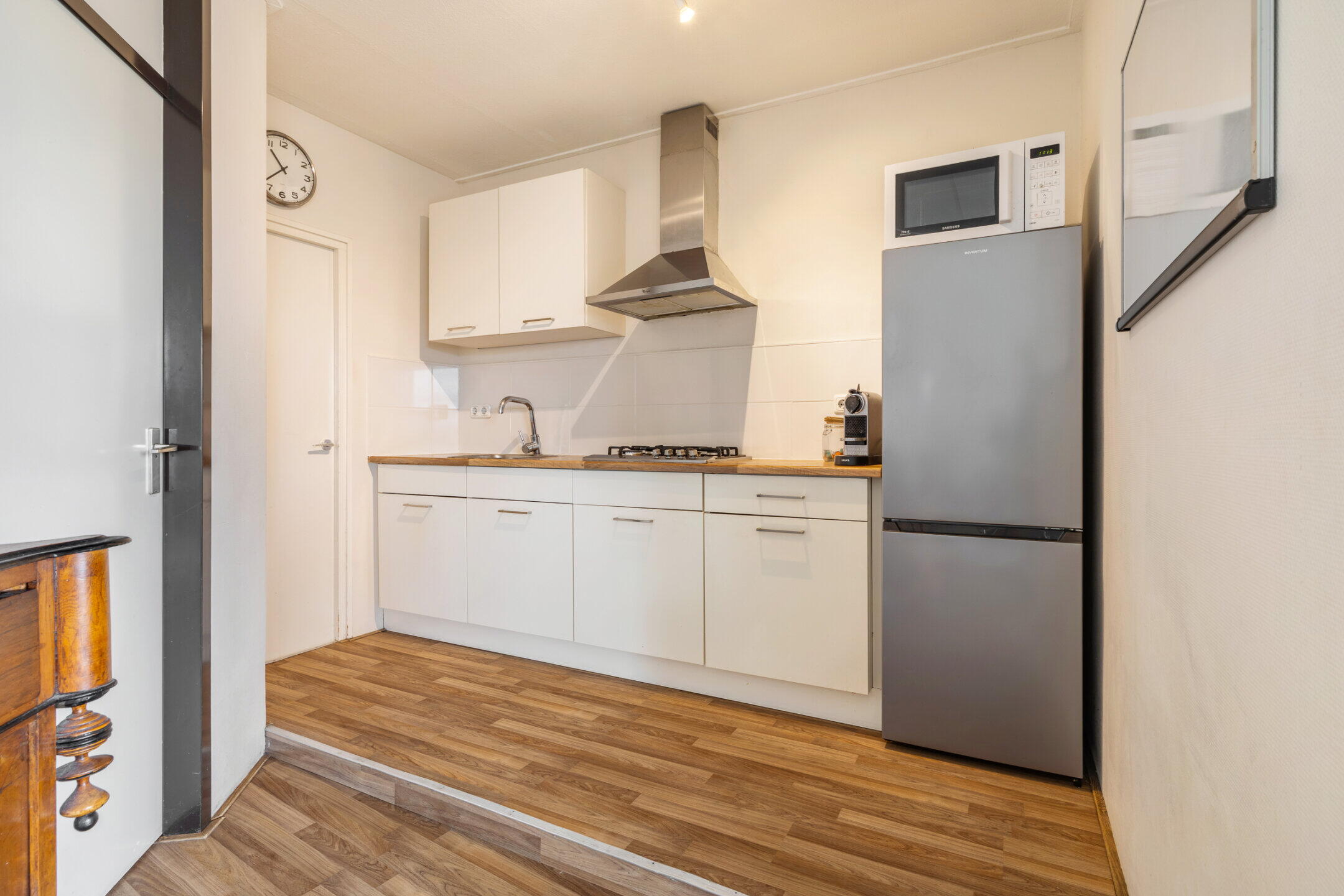 De woonkamer staat in open verbinding met de keuken (ca. 3.11 x 2.10m) welke is voorzien van een wandopstelling met diverse onder- en bovenkasten en inbouwapparatuur waaronder een 4-pits gaskookplaat, rvs afzuigkap, een losse koel/vriescombinatie en een spoelbak.